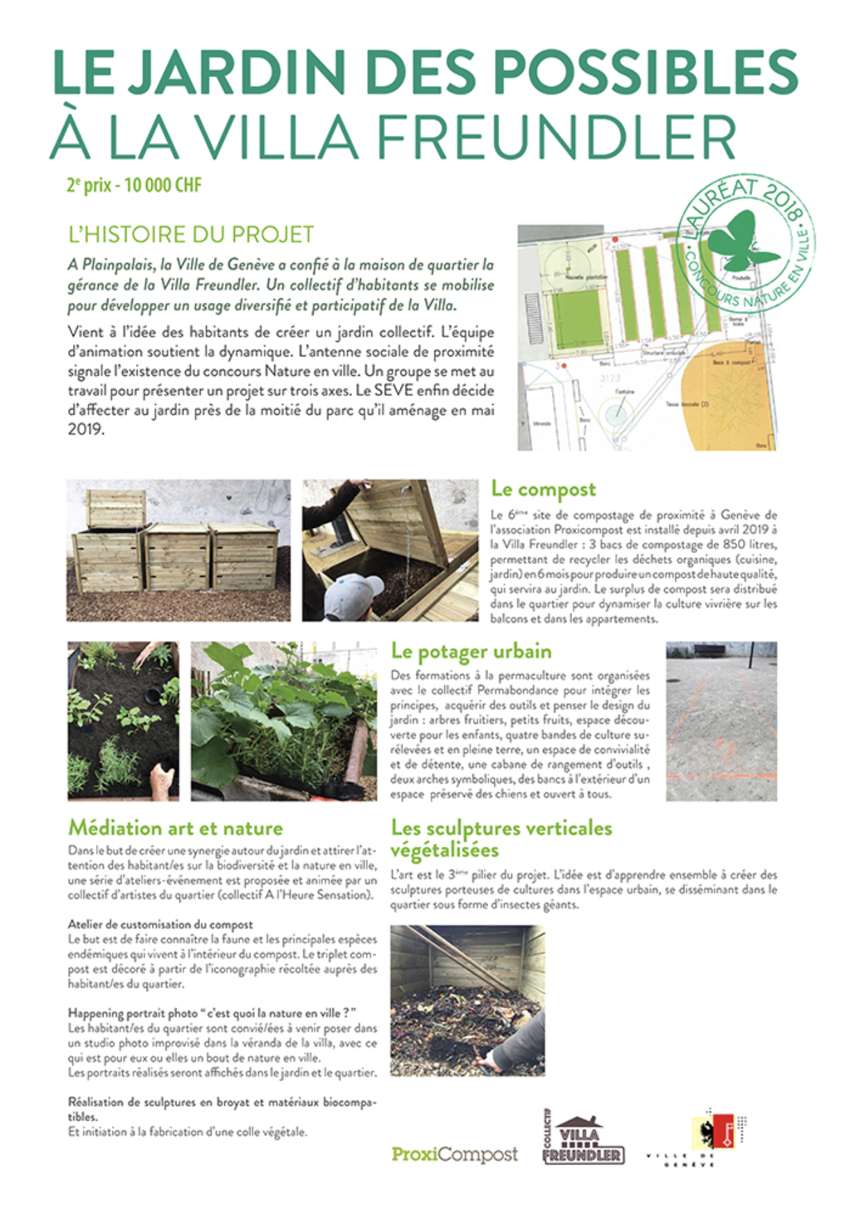 Né d’un souhait d’une habitante de voir fleurir un potager dans le parc de la villa Freundler, gagnant d’un prix Nature en Ville et soutenu par le Service des espaces verts, un collectif d’habitant·e·s cultive, selon les principes de la permaculture, les 150m2 de ce jardin collectif dans le respect du vivant.